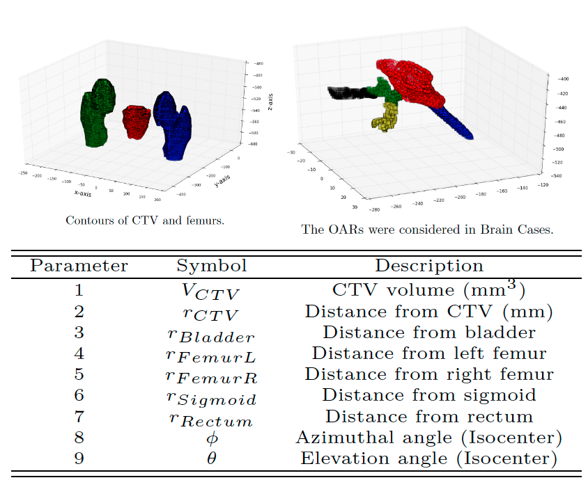The top two plots show the contours of organs and CTV/PTV in prostate and brain cases. The bottom table shows the parameters (input data) of my neural networks for prostate cases.