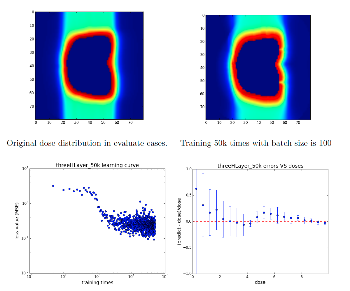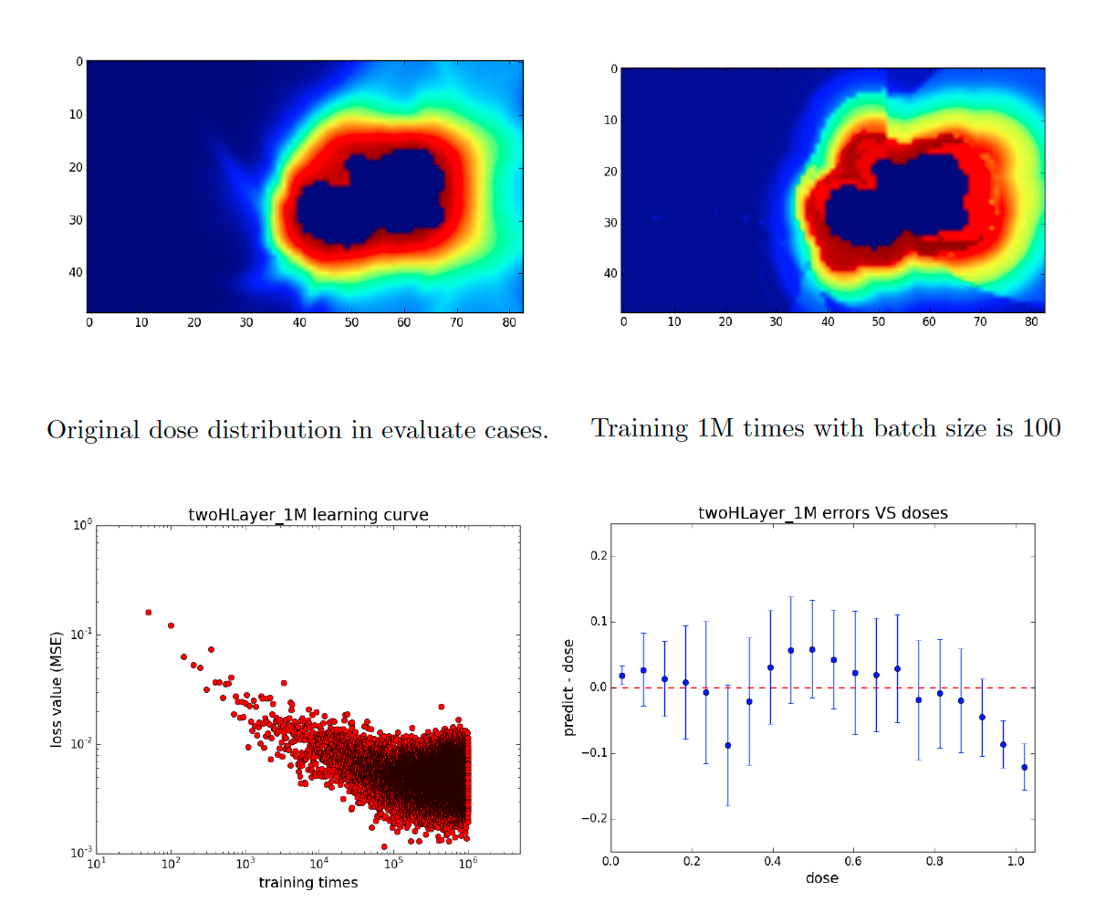 The neural networks model is built by TensorFlow. After I got all voxels' information from all the given cases, these datasets were randomly allocated, with three-fourths used for training, and one-fourth used for validation. The following plots show the training results for both prostate cases and brain cases. As you can see, the accuracy (dose error ratio) is very tiny in high dose area of prostate cases, and the dose error reaches to lower than 20% in all dose range of brain cases.