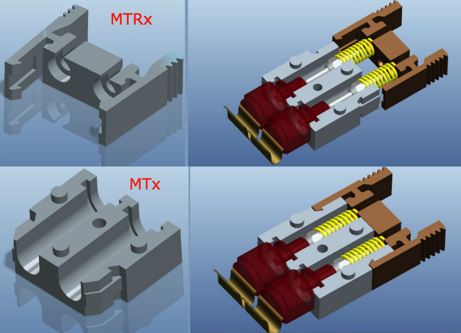 When we try to use the LC connector and related transceiver module to connect TOSA, we find their heights are exceed our requirement, 6 mm. We cannot find any module meet our needs on the market. Therefore, I need to develop the mid-board miniature dual channel optical transmitter (MTx) and transceiver (MTRx) by myself. After several revisions, I designed MTx and MTRx modules, and they will be used for detector front-end readout of the ATLAS Liquid Argon Calorimeter (LAr) trigger upgrade. For more detail, please see my paper: "Mid-board miniature dual channel optical transmitter MTx and transceiver MTRx". The following figure shows the CAD plots of MTx and MTRx.