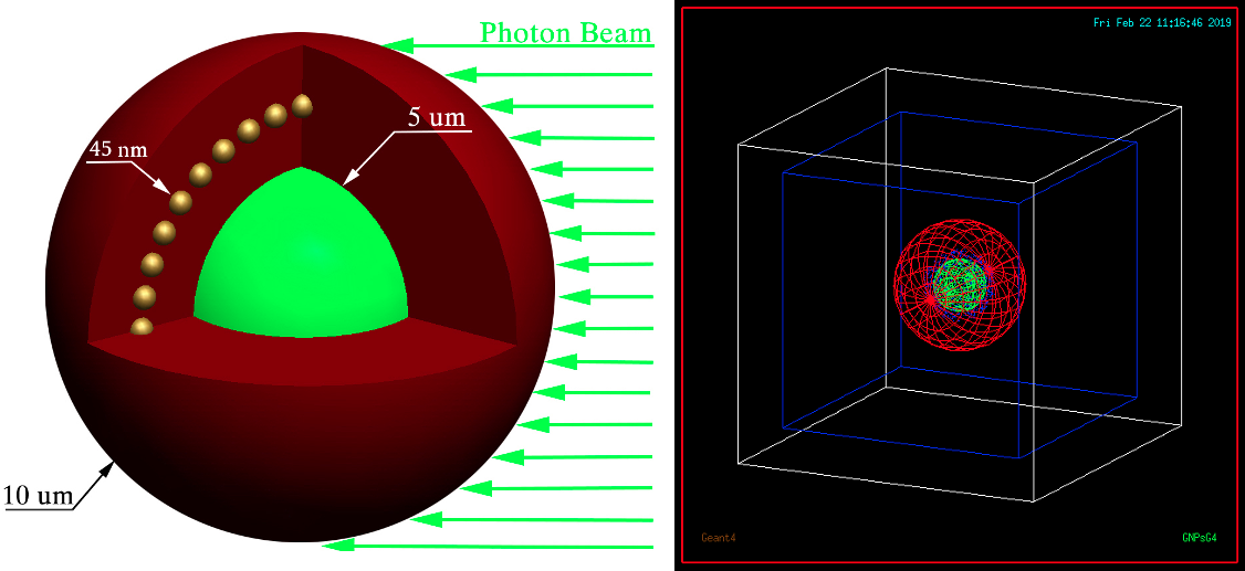 In 2019, a simple Geant4 single-cell model was built considering a realistic cell and organelle geometry in our lab, as shown in the above figure.