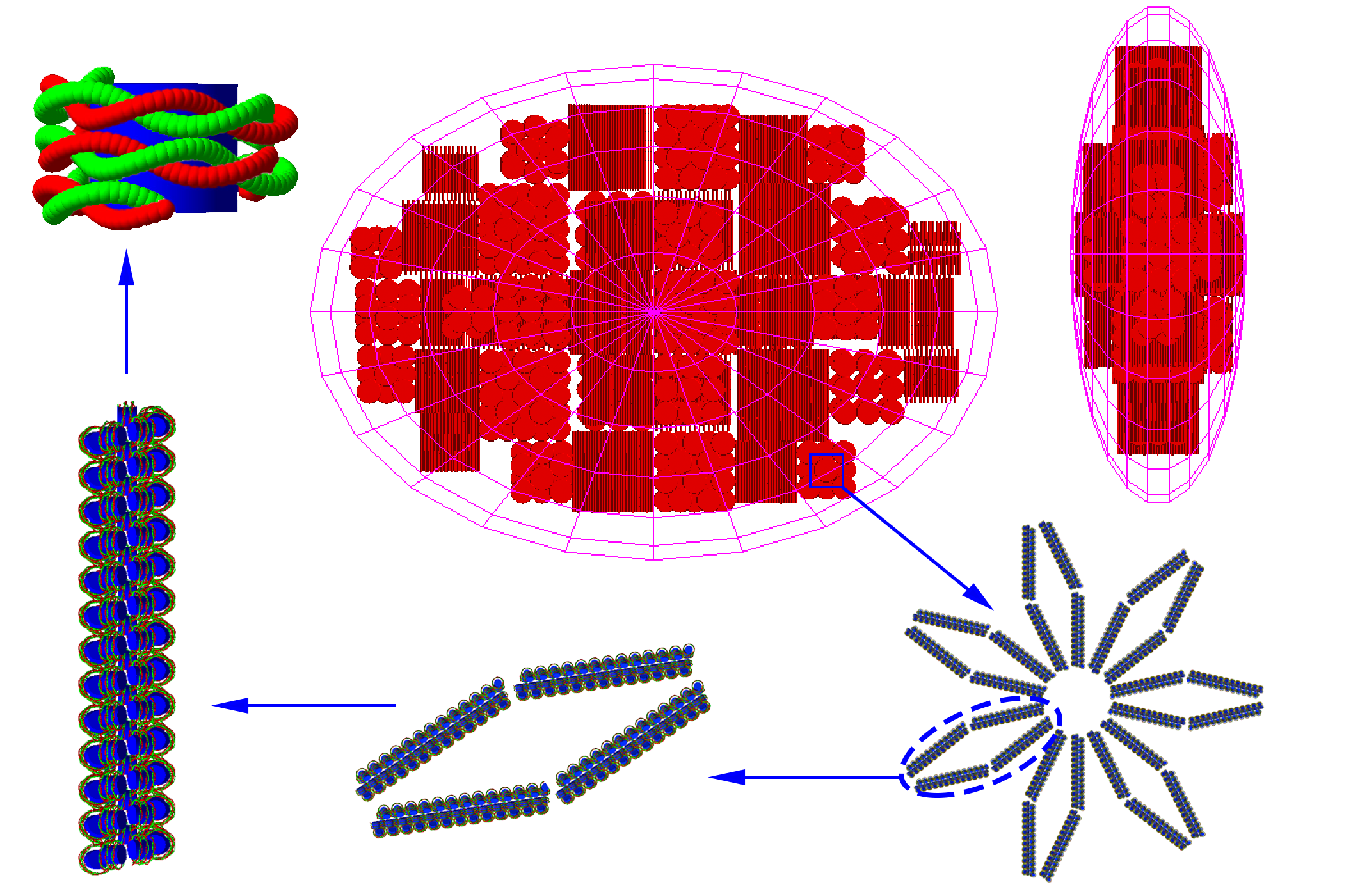 figure. an ellipsoid of half-axes 11.82x8.52x3.00 micrometer was determined for the nucleus model, which was then filled with a detailed DNA geometry to represent