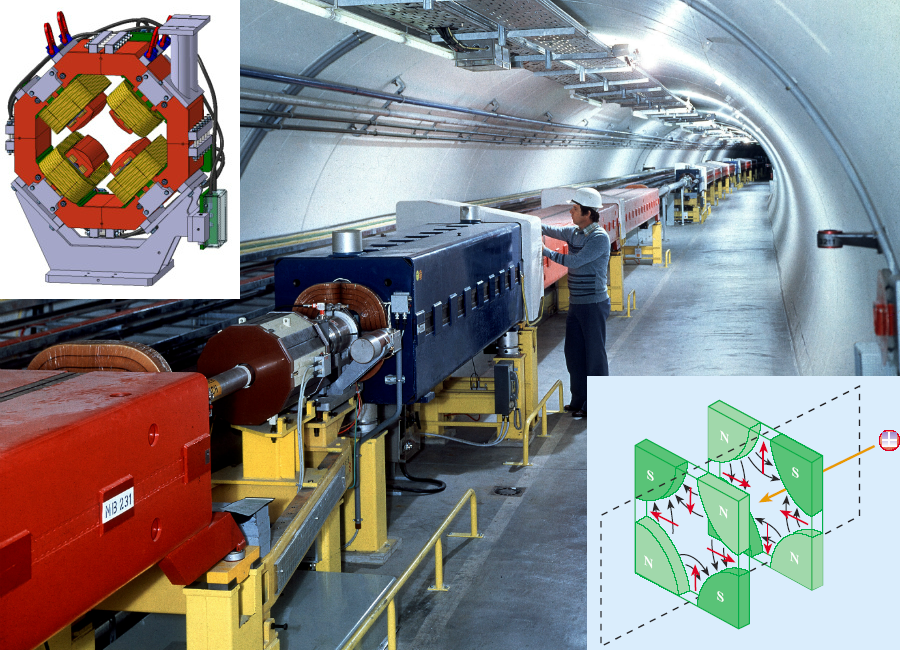 Super Proton Synchrotron is used to focus the proton beam, and the protons for LHC are accelerated in it. The left top plot is 3D model of the complex quadrupole magnets design. The right bottom plot is the schematic diagram about how the system appears to work: The black arrows show the direction of the magnetic field, the red arrows indicate the direction of the force on a proton, and the yellow arrow shows the direction of proton.