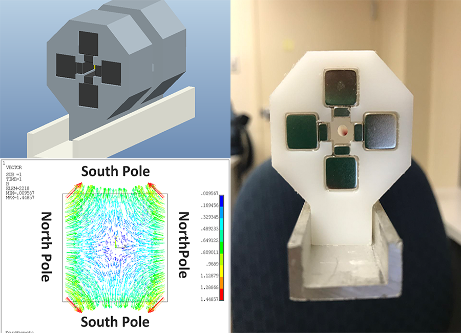 The left bttom plot shows the quadrupole magnetic field which is simulated by ANSYS. The left top plot shows the CAD design of the frame to hold the permanent magnets. The right plot shows the frame made by CNC.