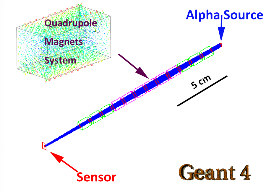 In this project, I simulated the magnetic field by ANSYS, design a frame to hold the permanent magnets by PTC Creo, and simulated the whole focusing process of alpha particle by Geant4. You can check the Geant4 simulation of focusing alpha beam in the bottom plot. In nature, the radiation of alpha source is isotropic. According to the simulation in my project, the sensor can receive more signal (increase 134%) after deploy the permanent magnets system!