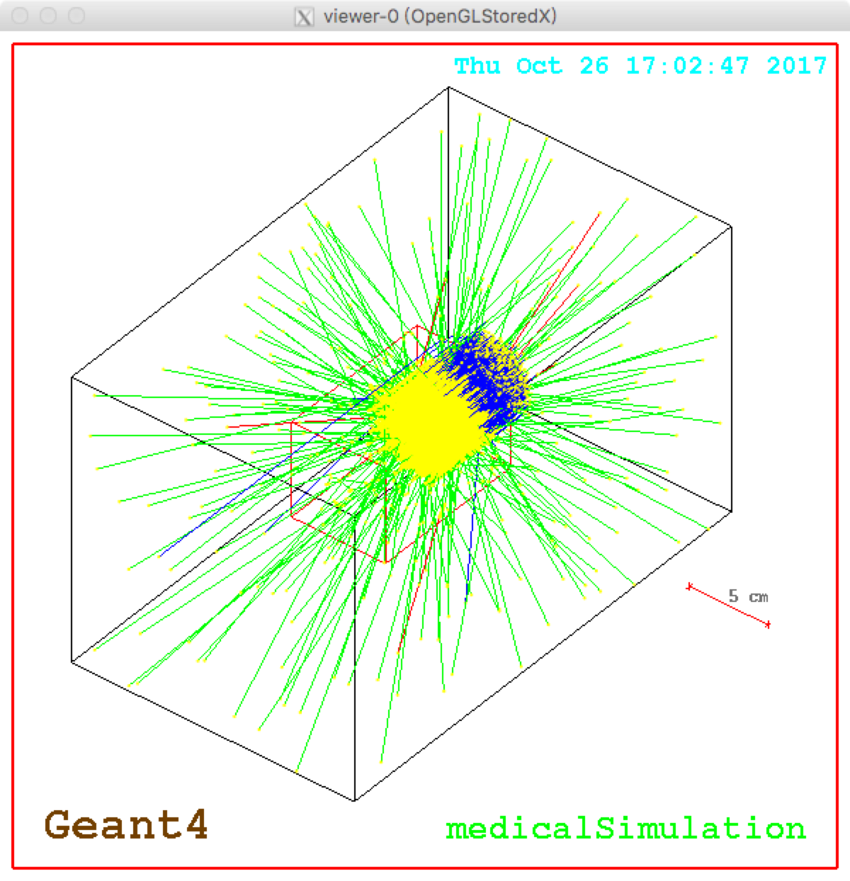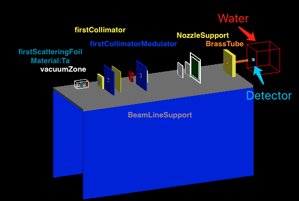 Hadron Therapy simulation example in Geant4. In the right side, there is a box that can be filled with water to simulate human tissue. A small detector can get different information (ex. the dose deposited in voxels) in specific position.