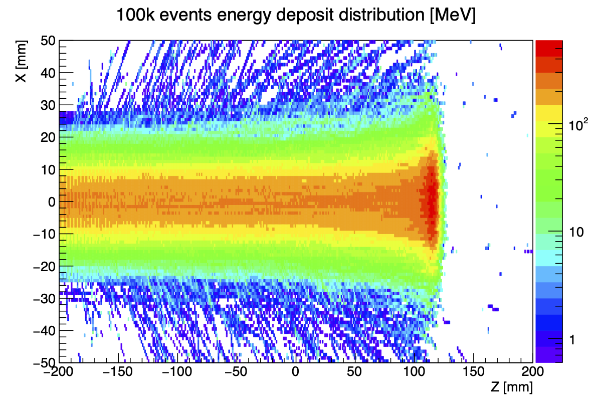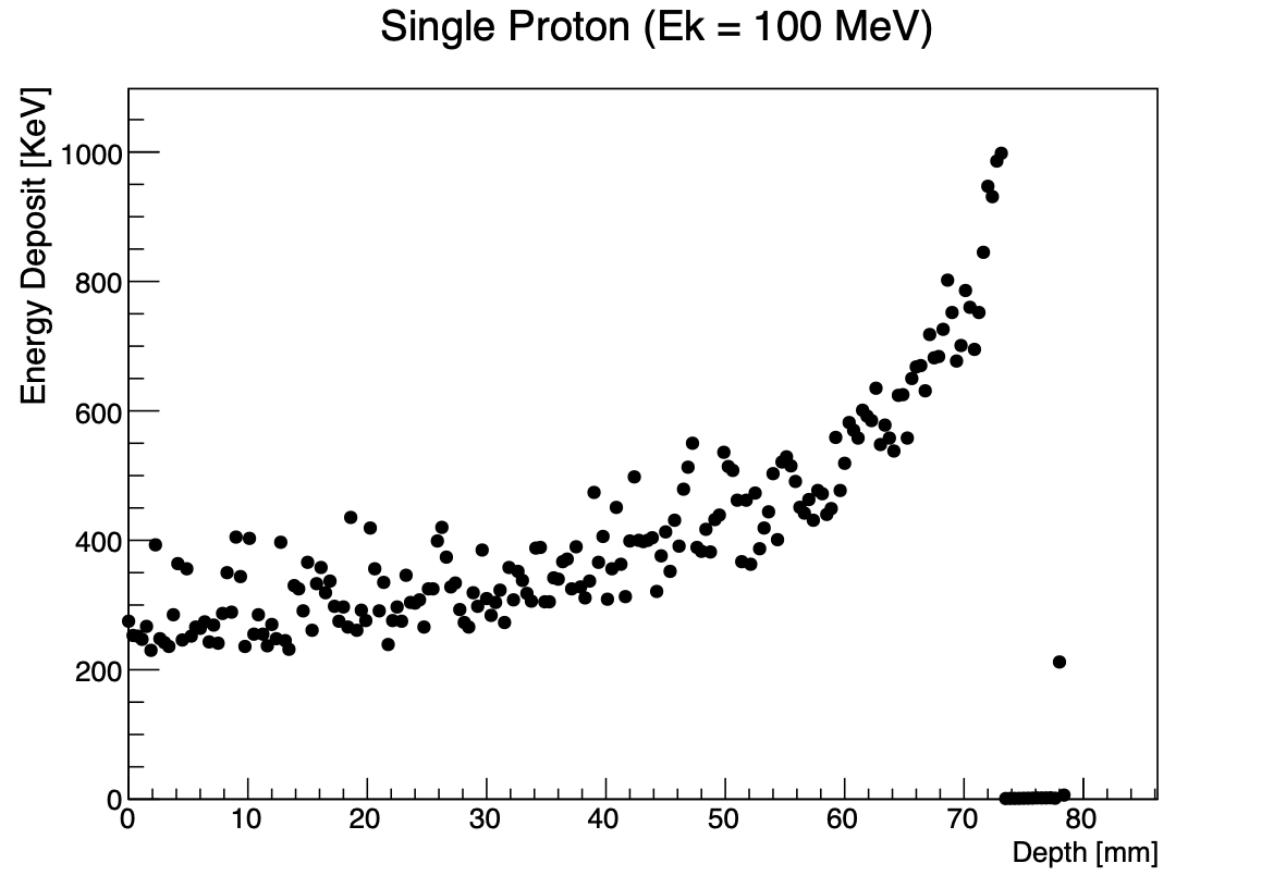 The reason why the proton beam can be used as surgical knife to destroy tumor, is the specific attributes of proton's ionizing radiation energy loss during its travel through matter. There is very few dose delivered to tissue during the proton's travel, util the last few millimeters before proton is stopped (loss its all kinematic energy). Based on this phenomenon, medical personnel use the particle accelerator to target a tumor with different depth by a beam of proton with different initial energy. The following figure shows the Geant4 simulation of a single proton's energy loss during its travel.