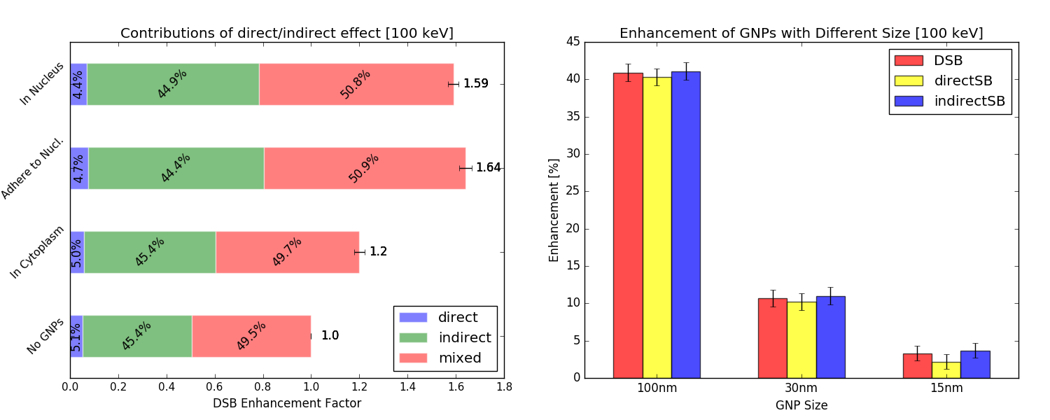 Left plot: DSB enhancement factor with different GNPs locations in 100 keV mono-energetic photon source, and the contributions of direct/indirect effect. Right plot: Enhancement of DSB, direct SB, and indirect SB with three different GNP size in 100 keV photon source.