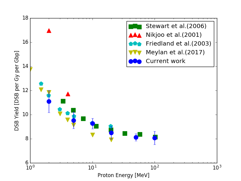 For example, mono-energetic protons from 2 MeV to 100 MeV. As shown in the following figure, the yield of DSB per Gy per Gbp induced by mono-energetic